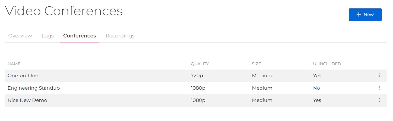 You can create a new Video Conference room by clicking the "+ New" blue button on the top right.