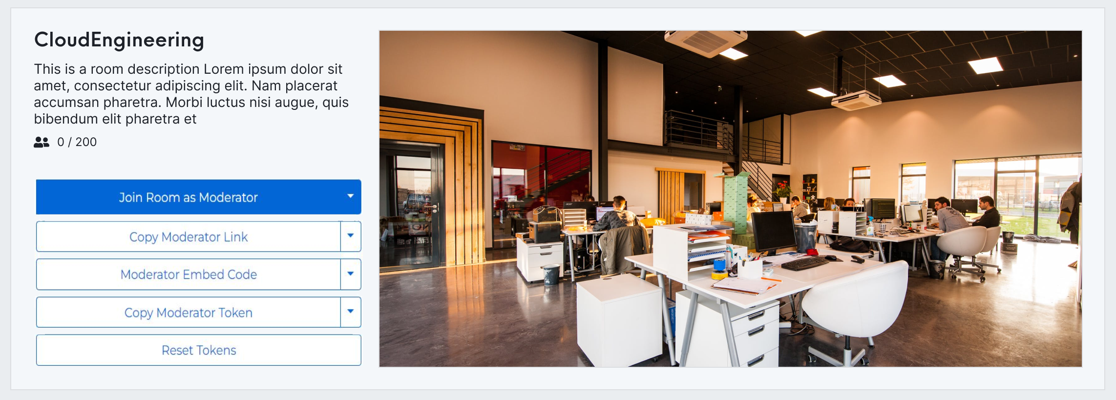 If you choose a room with a prebuilt UI, all you need to do is copy the embeddable code from the room's details page and drop it into your application.