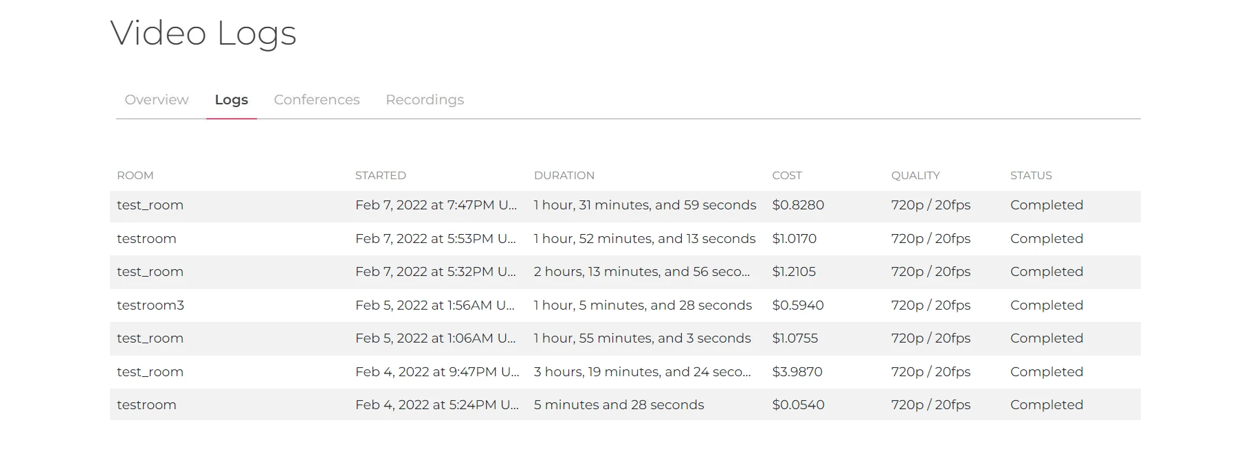 This tab is where you can find a detailed list of all video room sessions. This includes Video Conference rooms as well as API rooms.